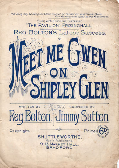 Sleeping safely within the depths of the Saltaire Collection is a magical example of theatre. A piece of music entitled ‘Meet Me Gwen On Shipley Glen’, composed by Jimmy Sutton with lyrics by Reg Bolton, in about 1900.
